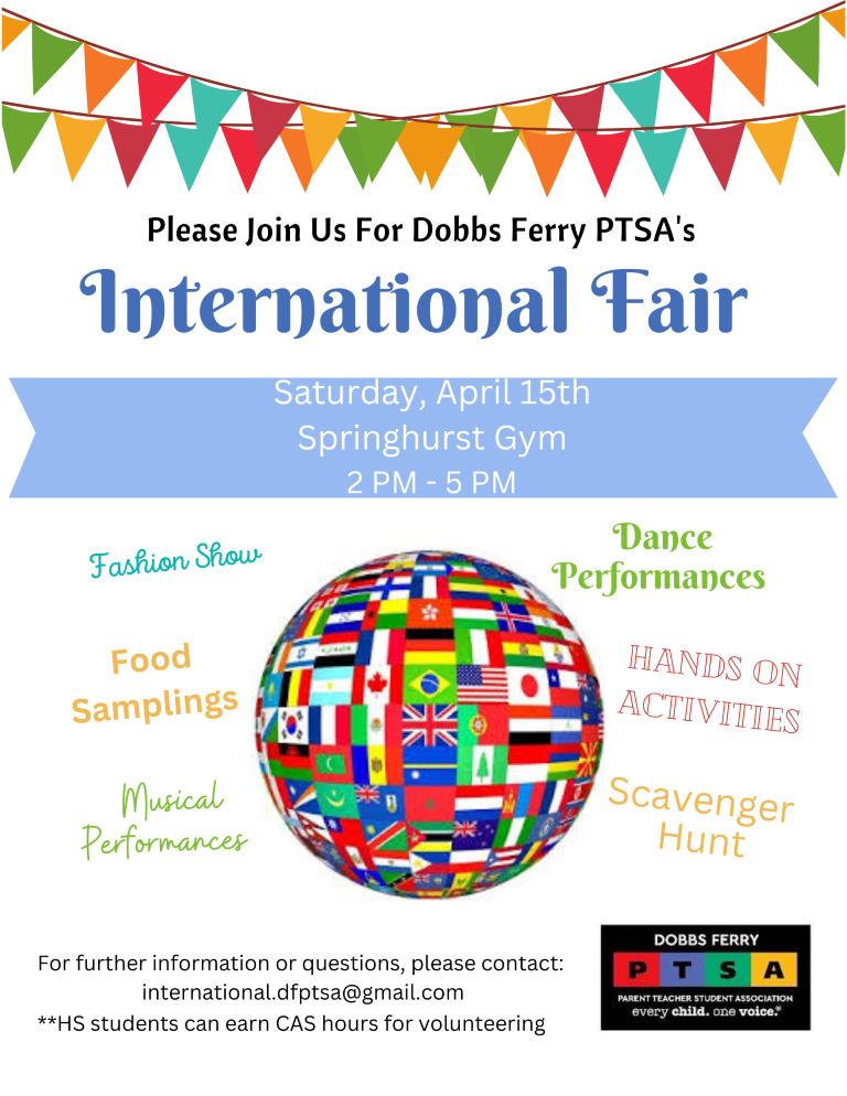 Celebrate the diversity of our community at the Dobbs Ferry International Fair this Saturday at Springhurst School in Dobbs Ferry from 2 pm to 5 PM. Candace Treglia and Ashley Kurien, co chairs of the International Fair provided us with some more great news: FREE FOOD AT THIS INTERNATIONAL CELEBRATION from the following restaurants: